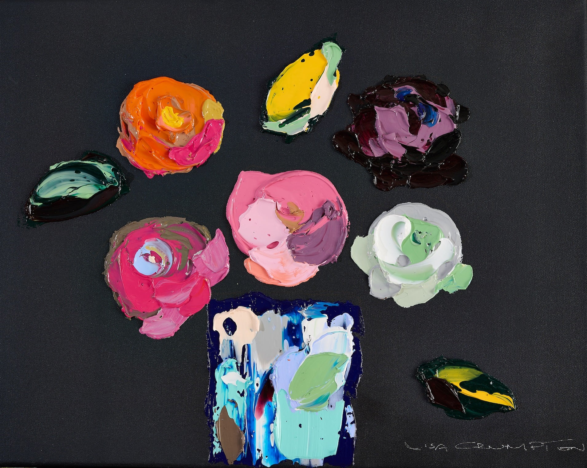 Using a palette knife, artist Lisa Crumpton has sculptured vibrant colourful petals. Achieved in one movement, these thick swaves of paint create 3D effect even as printed canvases. Painted in landscape Five Roses l & ll.