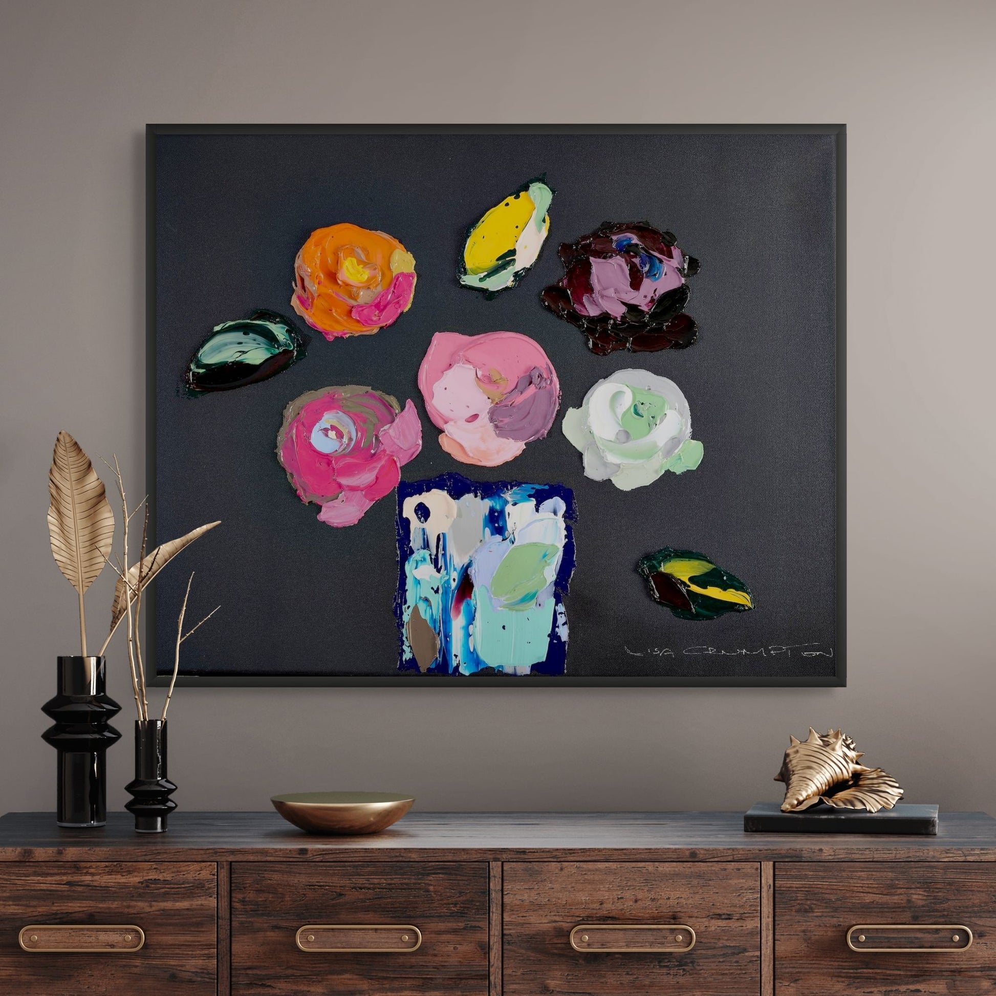Mesmerising. Made to make you feel! For over two decades, Johannesburg-based artist Lisa Crumpton has explored emotion through oil paint — blending bold colour with deep contrast. Her work spans abstract landscapes, florals, and seascapes, all inviting you to lean in… reflect on the reflections. Influenced by her early years in the Eastern Cape, Lisa’s art often echoes windswept dunes, sea scapes, and the sudden bloom of colour against shadow. Her signature? Vivid florals on black backgrounds — like hope emerging from stillness. These pieces inspire contemplation. View Lisa's collection showcasing original oil painting reproductions on gallery-grade canvas and artists paper. Some of these original artworks are available to purchase. Email info@ruthanne.com Custom sizes up to 130cmx130cmm Framed in Kiaat, Oak, Black, or White See it on your wall first with our preview tool on each product page There’s no single story here — only the one you see. Let it unfold in oil, light, and layers of possibility.