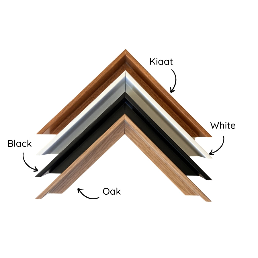 Our synthetic shadow box frames come in a range of colours and finishes. We have selected a shadow box frame which gives the illusion of a floating canvas within a frame. These frames enhance the product, giving it a slick modern finish. Colours available are Kiaat, Oak, White and Black.
